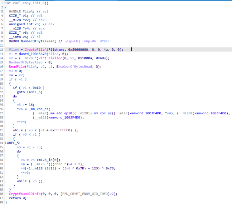重温一下上一步下载了一个libcurl.dll,看导出表似乎是一个正常的DLL。不过跟踪到.text:004023BA 12060 call sub_402960,函数看起来很正常: