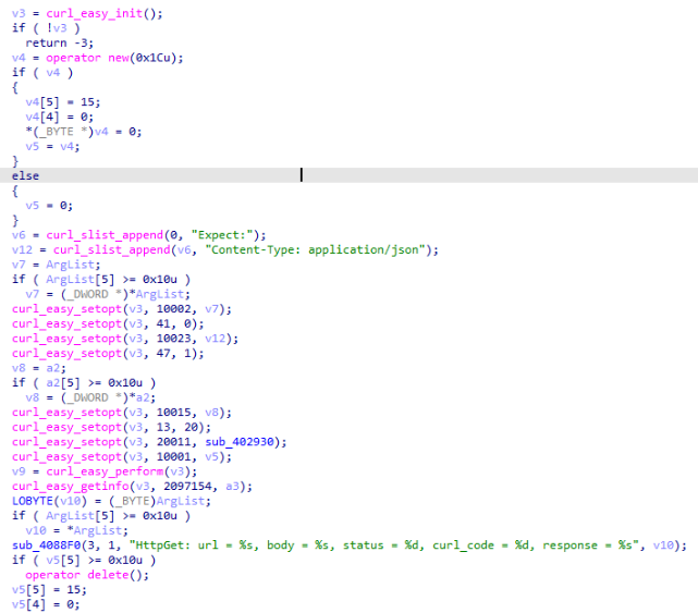实际上curl_easy_init这个函数就被篡改了,程序流程跑不到下面。