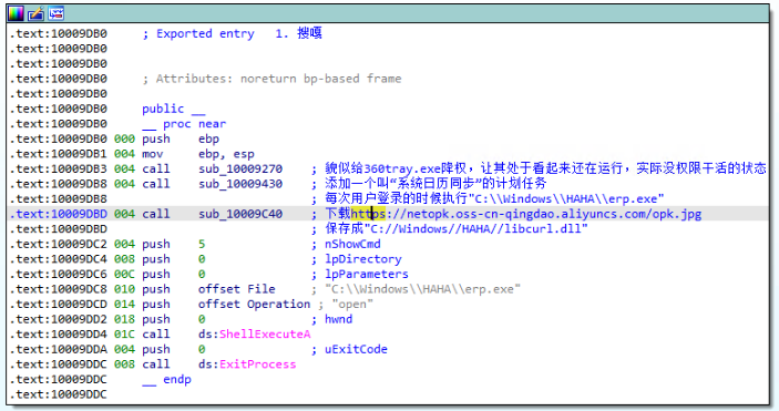 这个DLL的功能看图几乎一目了然:干360、实现驻留、下载关键DLL、启动下一级erp.exe,最后的ExitProcess退出CNM.exe进程。