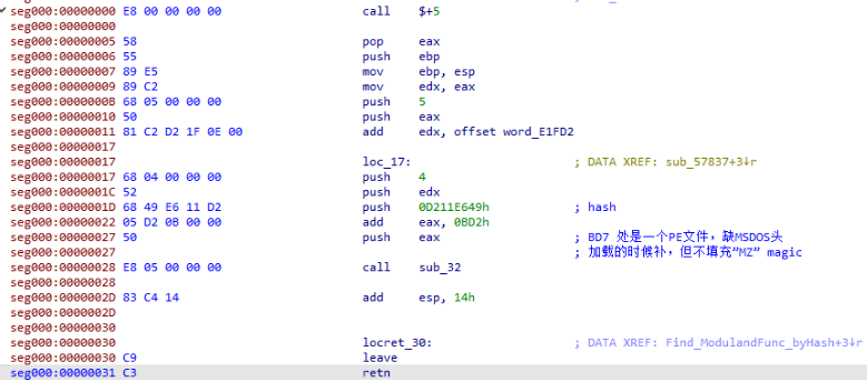这个shellcode本质上和前面的那个shellcode一样,位尾部附带了一个DLL,自身是一个Loader。