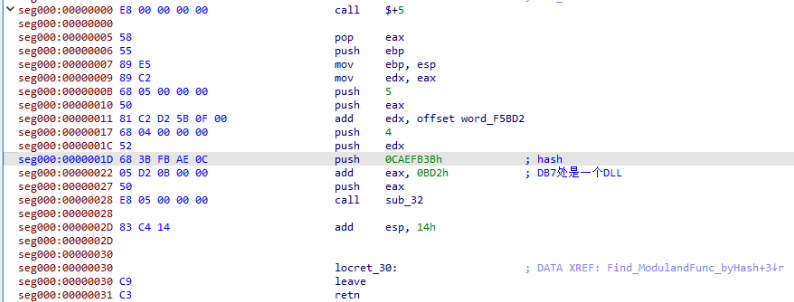 函数sub_32加载dll,并用call eax跳转到dll的entry point。