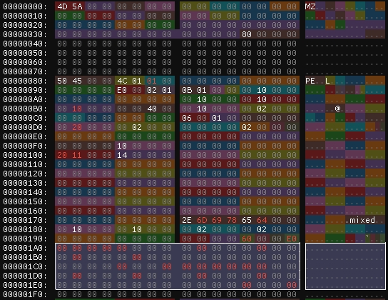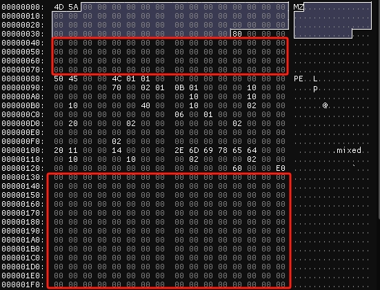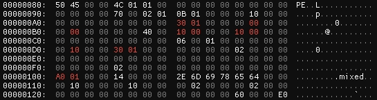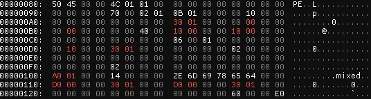 | 0xB0 | 0xB0 | 4 | BaseOfData | 0x00 | PE Headers 和 .mixed 节共用同一块内存,设置基址为 File / Image 的起始位置 0x00 |