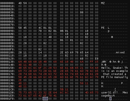 | 0x1AE | 0x1AE | “This is an example that created a PE file manually.” | 消息内容 |