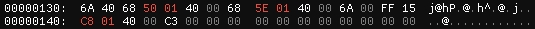 { 0x6A, 0x40, 0x68,0x50, 0x01, 0x40, 0x00, 0x68, 0x5E, 0x01, 0x40, 0x00, 0x6A, 0x00, 0xFF, 0x15, 0xC8, 0x01, 0x40, 0x00, 0xC3 }