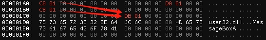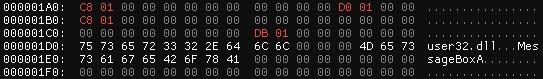 如果读者是按照我上面说的整体复制,那么导入表中,实际上只有 4 个非0的偏移量需要修改(下图中红色部分)。其他的字符串和全是00的地方不变。
